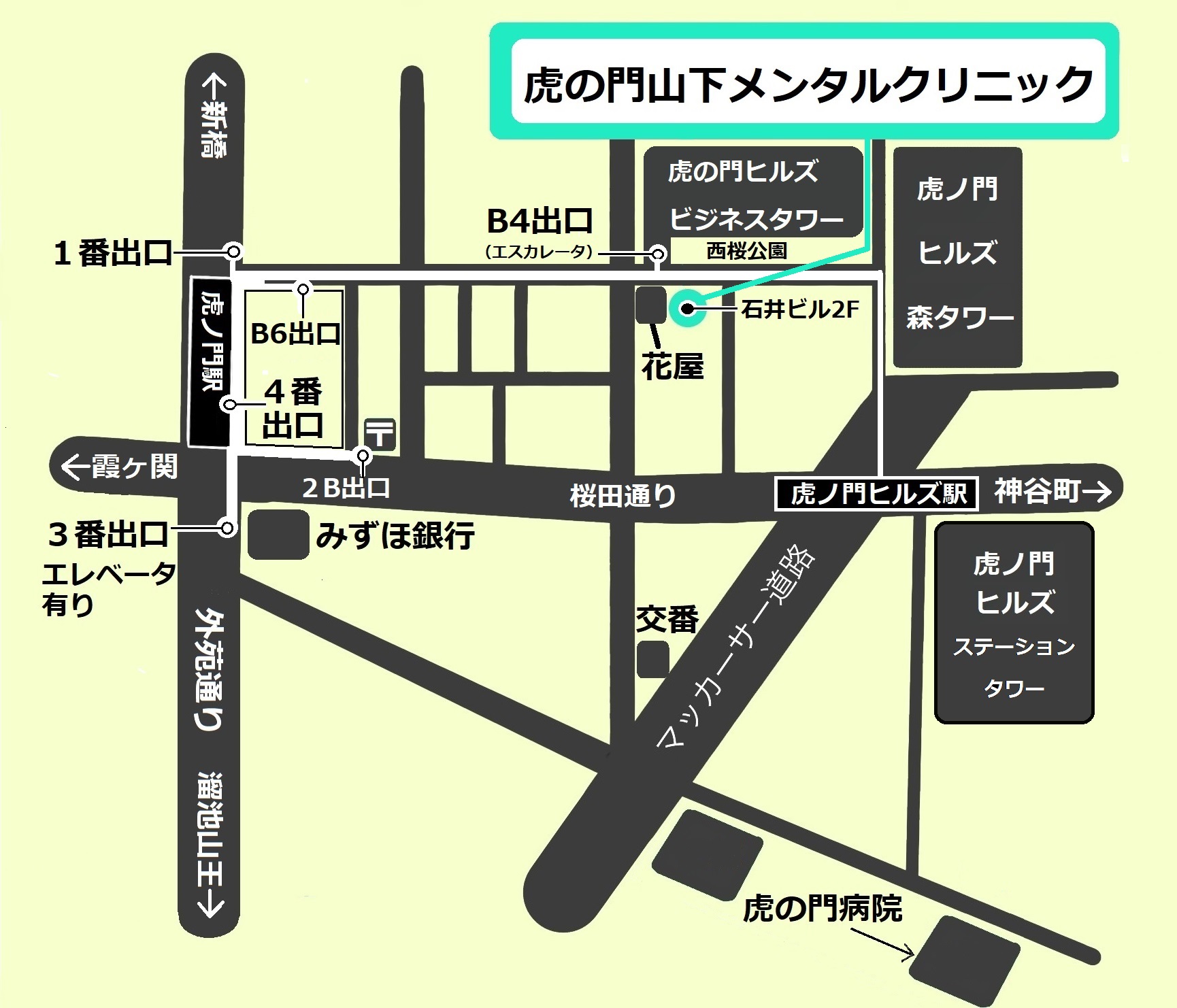 東京メトロ銀座線虎ノ門駅から日比谷線虎ノ門ヒルズ駅に向かう連絡地下道を通り、B4出口のエスカレータまたはエレベータを利用して地上に上がると西桜公園に出ます。その向かい側右から左に、目印のお花屋さん(サクラフローリスト)、歯科医院、佐川急便があります。